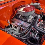 The exterior of this classic car is finished in a striking combination of Hugger Orange and Tan, exuding a sense of timeless style and sophistication. The vibrant Hugger Orange paint captures attention and showcases the iconic lines and contours of the Bel Air. Complemented by the Tan accents, this color scheme adds a touch of elegance to the overall appearance.